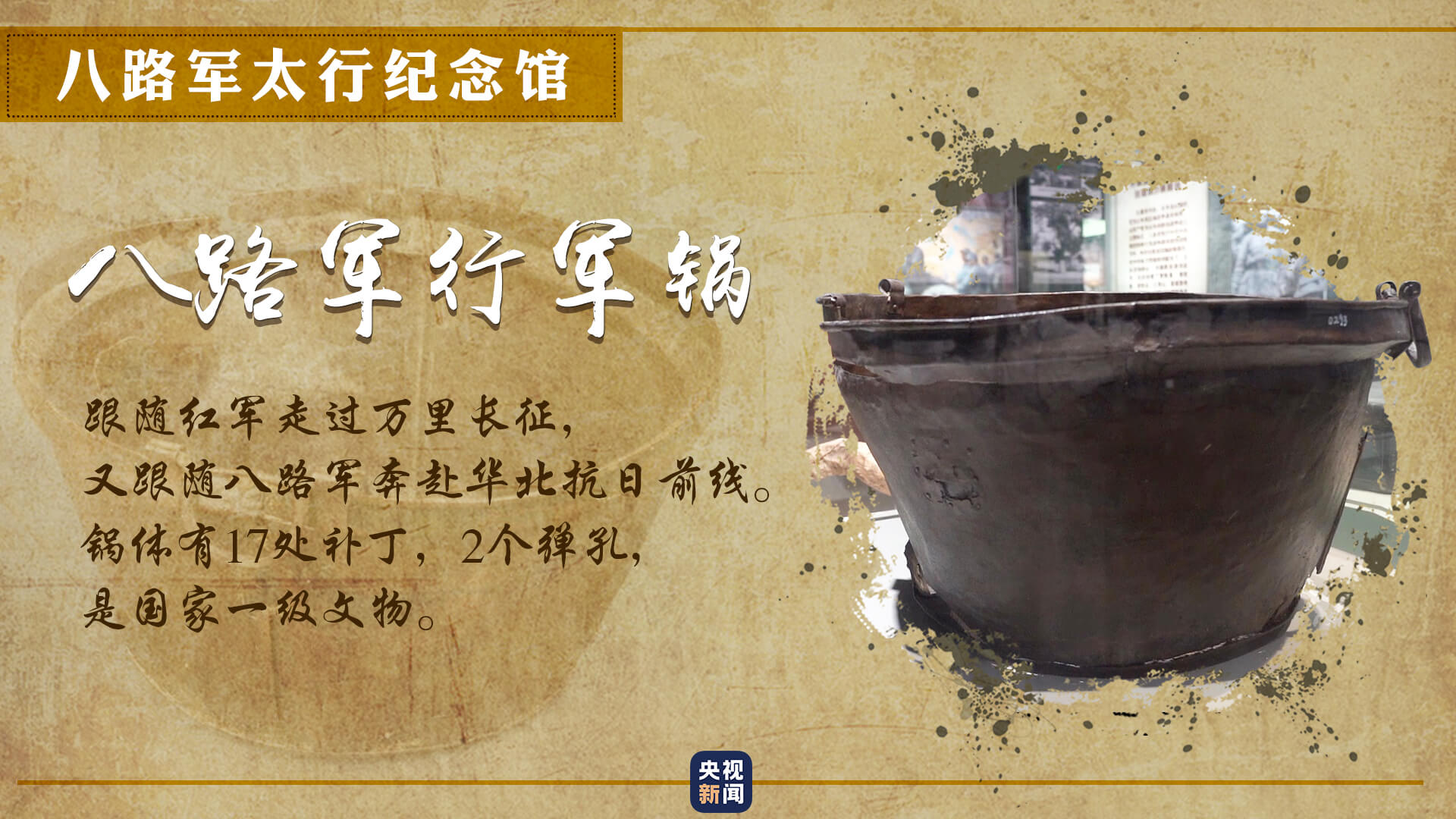 一口行军锅,跟随红军完成了两万五千里长征,又跟随八路军东渡黄河开赴华北抗日前线。