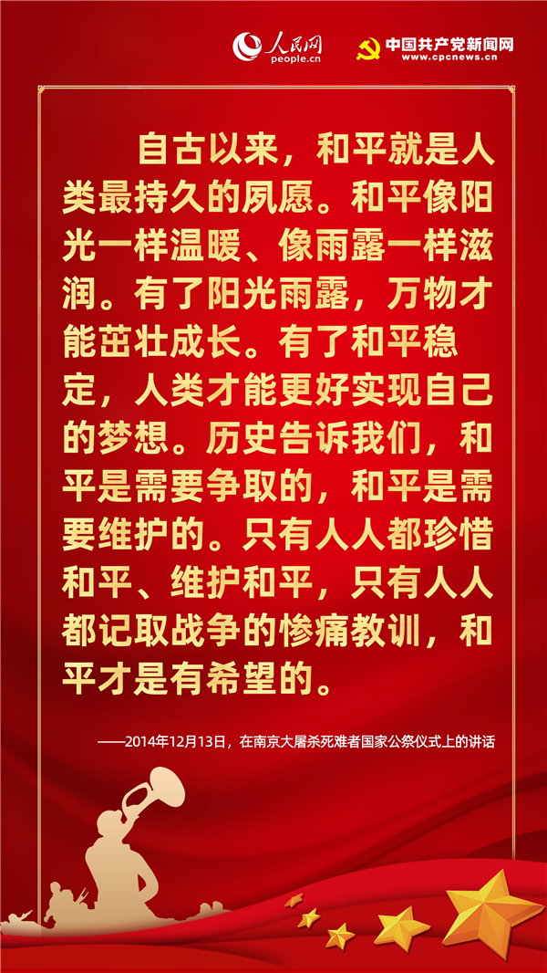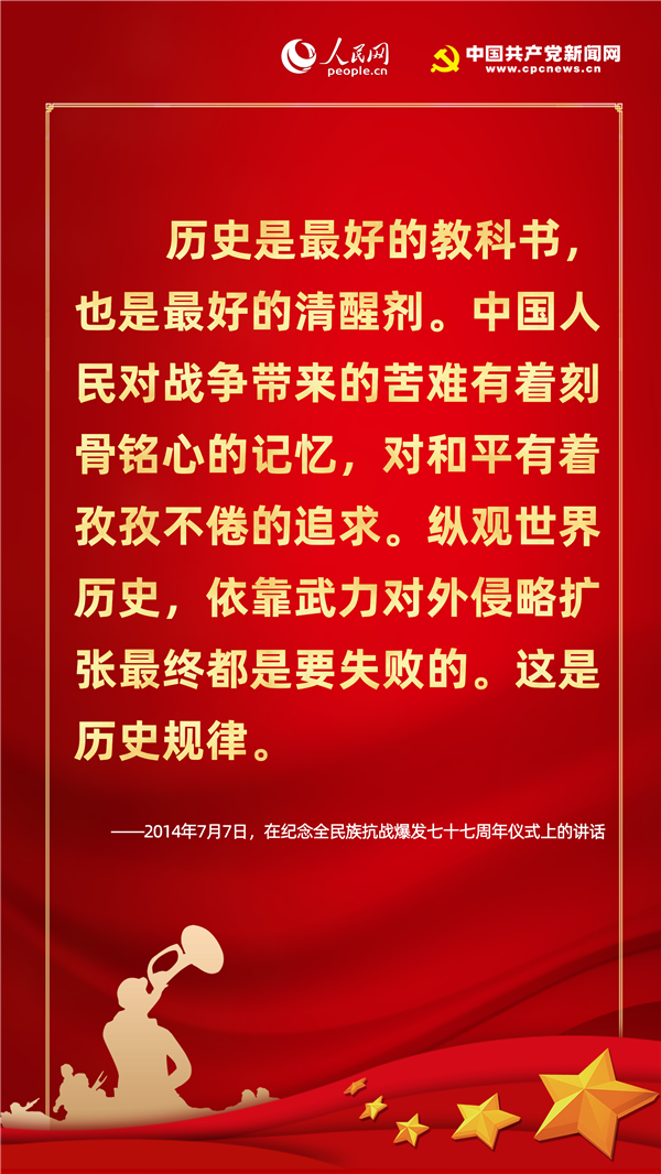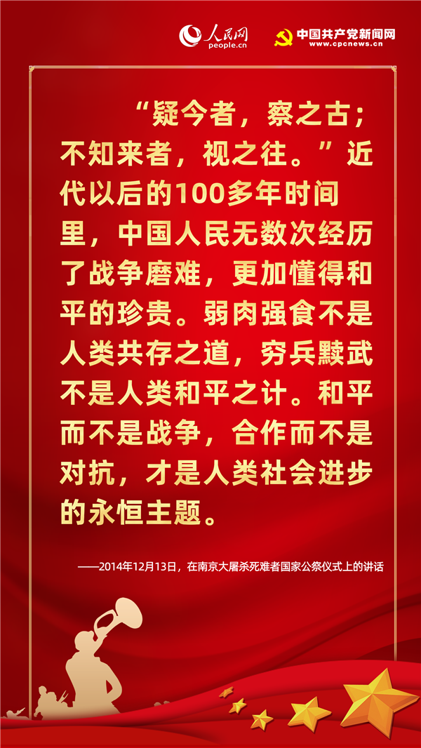 历史不仅关乎过去,更关乎现在和未来。纪念历史不是为了咀嚼苦难、延续仇恨,而是为了重申和平与正义的价值,从历史中汲取智慧,获得开创未来的精神力量。在七七事变83周年的今天,人民网·中国共产党新闻网梳理十八大以来席大大总书记有关“战争与和平”的重要论述,让我们一起“铭记历史、缅怀先烈、珍视和平、警示未来”。