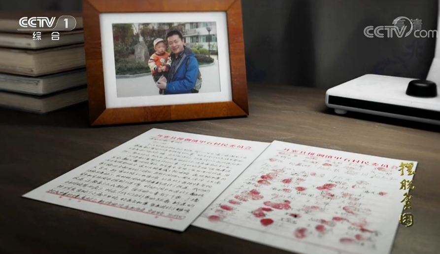 由于连续天旱,村里的香菇基地断了水。 【同期】国家审计署企业审计一局三处副处长 贵州省丹寨县甲石村原第一书记 姜海泉 干成这个样了,这么轻了现在。你肯定得找水,再不找水咱们颗粒无收了这个样子。 姜海泉:刚来的时候有的地方,走那个田坎儿,有的时候差点都能掉下去。有一次掉下去了,那次好像是(村民)再荣和谁他们又把我给拉住了,现在慢慢就习惯了。 【同期】贵州省丹寨县甲石村党支部书记 李大春 现在姜书记不怕,姜书记(爬山)还比我们凶(厉害),上山下山这些还比我们凶(厉害)。 【解说词】 大伙齐心协力,从山沟里把水引了过来。香菇大棚里喷洒的水滴滋润了干涸的菌种,也滋润了村民的心。 第一书记的任期是两年,当姜海泉任期届满时,他舍不下村里还不牢靠的产业,村民也不舍得他们的姜书记。村民连续两年发出联名信,一个个饱含信任的红手印让姜海泉在甲石村又坚守了两年。