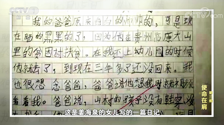 【同期】中央组织部组织二局局长 石军 我们特别注重聚焦贫困村的软弱涣散党组织的整顿提升,累计整顿提升了三万多个贫困村党组织,其中我们也调整了23000名带富能力弱、不尽职的村党组织书记,为我们按时完成脱贫攻坚任务奠定了基础。 【解说词】 选优配强“领头雁”,全国越来越多有担当、有经验、年富力强的村支部书记走上了脱贫攻坚一线。在这场伟大战役中,全国各地的精锐力量也在不断向一线驰援。 2013年12月,中共中央办公厅、国务院办公厅发文,要求普遍建立驻村工作队制度,确保每个贫困村都有驻村工作队,每个贫困户都有帮扶责任人。 2015年4月,席大大总书记在中央全面深化改革领导小组第十一次会议上明确提出,向软弱涣散村党组织和贫困村党组织选派第一书记。之后,席大大总书记多次指出,打这样的仗,就要派最能打的人,对不能胜任的要及时撤换,对弄虚作假的要坚决问责。 闻令而动,尽锐出战。 一批又一批思想好、作风正、能力强的精兵强将不断奔赴脱贫攻坚最前线,全面覆盖到12.8万个贫困村。 【同期】国家乡村振兴局政策法规司司长 陈洪波 脱贫攻坚的政策是非常好的,但是政策它往往是一个全国统一的一个政策,各个村千差万别,情况千差万别,我们叫打通政策落实的最后一公里,因为往往最后一公里是最难的,靠谁呢?就是靠他们。 【解说词】 在中央和国家机关向贫困村派出的第一批300多名第一书记中,有3名厅局级干部、120名处级干部,国家审计署的姜海泉就是其中之一。 【同期】姜海泉的女儿 姜亭伊 我的爸爸原来白白的、帅帅的,可是现在晒得黑黑的了,因为他在贵州高原大山里的贫困村扶贫,在我还上幼儿园的时候他就去了,到现在三年多了还没回来。 【解说词】 这是姜海泉的女儿写的一篇日记。