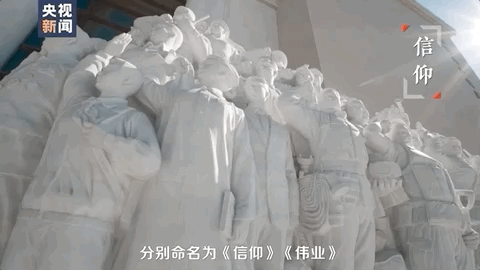 在中国共产党历史展览馆的西侧广场上,耸立着五组雕塑。一面火红的《旗帜》,代表着方向;有四组汉白玉雕塑,分别命名为《信仰》《伟业》《攻坚》和《追梦》,展现了一百年来中国共产党和中国人民休戚与共、生死相依、奋勇前进的奋斗历程。