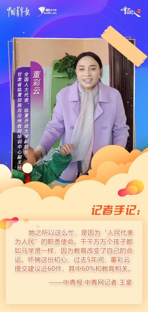 她之所以这么忙,是因为“人民代表为人民”的职责使命。千千万万个孩子都如马学贤一样,因为教育改变了自己的命运。怀揣这份初心,过去5年间,董彩云提交建议近60件,其中60%和教育相关。