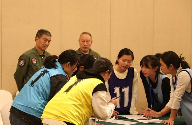 2023年4月4日,参加海军招飞选拔的学生在心理选拔环节讨论发言,海军飞行人才心理选拔专家对参检学生进行活动观察。