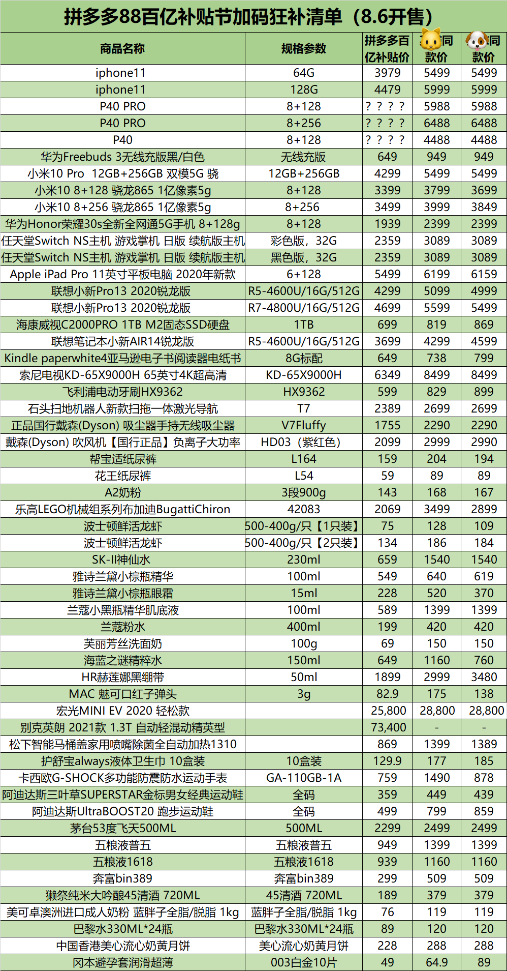 拼多多“百亿补贴节”公布的部分价格清单显示,平台包括iPhone 11、任天堂Switch、SK-II神仙水、花王纸尿裤等在内热门商品售价均大幅低于其他渠道销售价格。