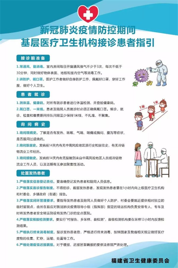 福建日报·新福建客户端1月20日讯(记者 张静雯 储白珊)为进一步加强冬春季农村地区基层医疗卫生机构疫情防控工作,省卫健委日前印发《新冠肺炎疫情防控期间基层医疗卫生机构接诊患者指引》,要求各地督促基层医疗卫生机构和村卫生所、社区卫生服务站严格遵照执行,指导基层医务人员做好接诊工作。