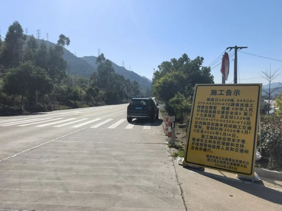 施工期间,该路段将实行交通管制。连江公路中心将严格督促施工单位按照审批通过的保通保畅方案,落实安全布控措施,严守安全生产底线,统筹抓好工程质量、施工进度与道路通行保障。请过往车辆及行人按照交通警示标志减速慢行,确保通行安全。(图片由连江公路中心提供)