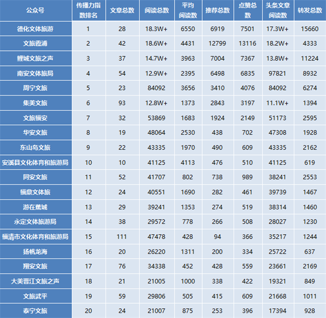 监测结果显示,10月共有67个县级文化和旅游政务微信公众号在更新、发布新内容。综合各项传播数据,10月福建省各县(市、区)文化和旅游政务微信公众号传播影响力指数前20名依次是:德化文体旅游(泉州市德化县)、文旅霞浦(宁德市霞浦县)、鲤城文旅之声(泉州市鲤城区)、南安文体旅局(泉州南安市)、周宁文旅(宁德市周宁县)、集美文旅(厦门市集美区)、文旅福安(宁德福安市)、华安文旅(漳州市华安县)、东山岛文旅(漳州市东山县)、安溪县文化体育和旅游局(泉州市安溪县)、同安文旅(厦门同安区)、福鼎文体旅(宁德市福鼎市)、游在蕉城(宁德市蕉城区)、永定文体旅游局(龙岩市永定区)、福清市文化体育和旅游局(凯发k8福清市)、扬帆龙海(漳州市龙海区)、翔安文旅(厦门市翔安区)、大美晋江文旅之声(泉州晋江市)、文旅武平(龙岩市武平县)、泰宁文旅(三明市泰宁县)。