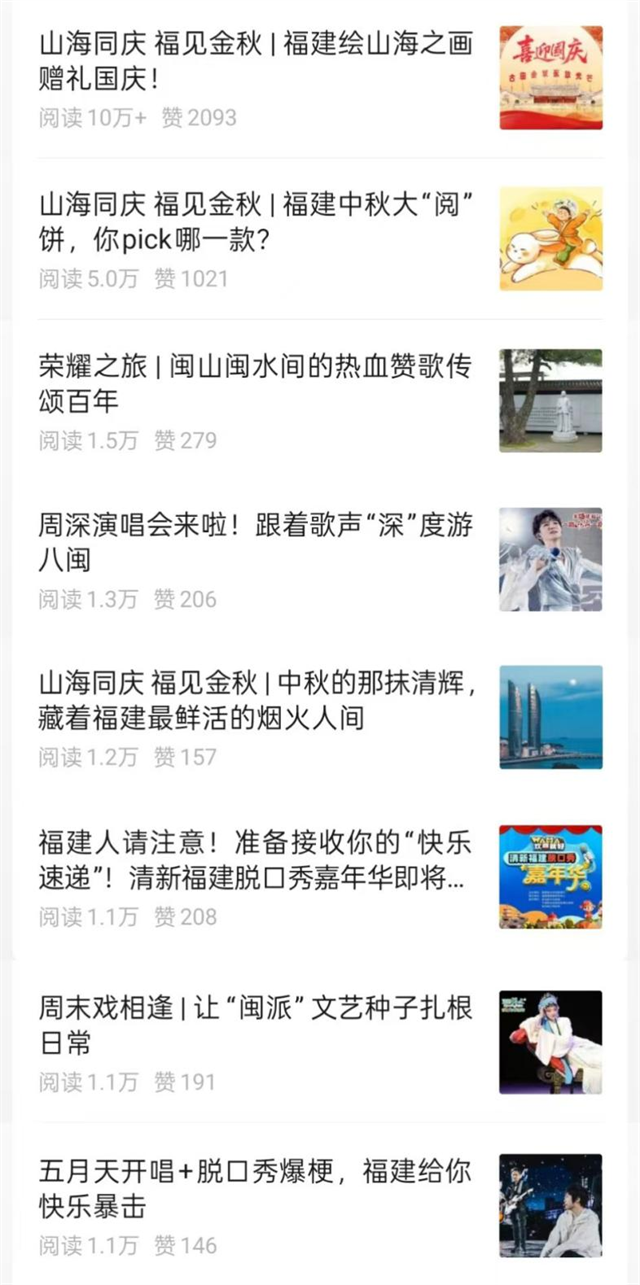 十月发布主题紧密围绕“国庆中秋双节”、“清新福建脱口秀嘉年华”以及影视剧《沉默的荣耀》等热点展开,通过精心策划的“山海同庆 福见金秋”国庆中秋专题,推文篇均阅读量突破万次。十月也是全省文旅线下脱口秀活动展演时期,线上同步发布,推广幽默文旅,配合文创礼品赠送,引发网友分享推荐形成传播裂变。 本月共有33篇推文阅读量突破“1万+”,其中阅读量“10万+”的爆款文章为《山海同庆 福见金秋 福建绘山海之画赠礼国庆!》(10月1日),阅读量达“5万+”的推文是(《山海同庆 福见金秋 福建中秋大“阅”饼,你pick哪一款?》,10月6日),显示出优质内容产出能力持续稳定。为保证平台阅读量保持高热,平台积极与@蒸鸭梨儿、@熊纠纠、@张宇超等自媒体达人及内容机构建立创作授权关系。10月份通过征稿形式采用9条优质内容,篇均阅读量均达“1万+”,进一步丰富了内容视角,更好地满足了用户对个性化、品质化文旅信息的需求。
