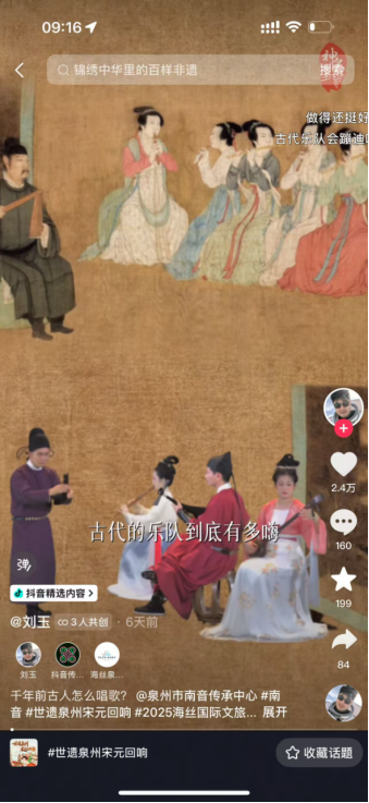 在抖音平台的300多个短视频作品中,泉州非遗不再是博物馆中的标本,而是化身可体验、可传播的“生活美学”。创新文旅推介,讲好泉州故事,以文塑旅,以旅彰文。要让泉州成为全国最具烟火气的旅游城市、世界海丝多元文化旅游目的地,讲好泉州故事是一条重要路径。 本月“泉州世遗宋元回响”话题的火热,也离不开达人们在文旅推介上的创新。不少达人借助AI人工智能手段,还原泉州的千年历史。来自四川的传统文化创作者刘玉,拥有485万粉丝,他在泉州市南音传承中心体验学习南音。以我国十大名画《韩熙载夜宴图》为切入点,特地为画中场景编曲,让名画“活”起来。他的短视频,不仅让百万网友看见古人生活娱乐场景,而且也深入挖掘千年南音文化价值。
