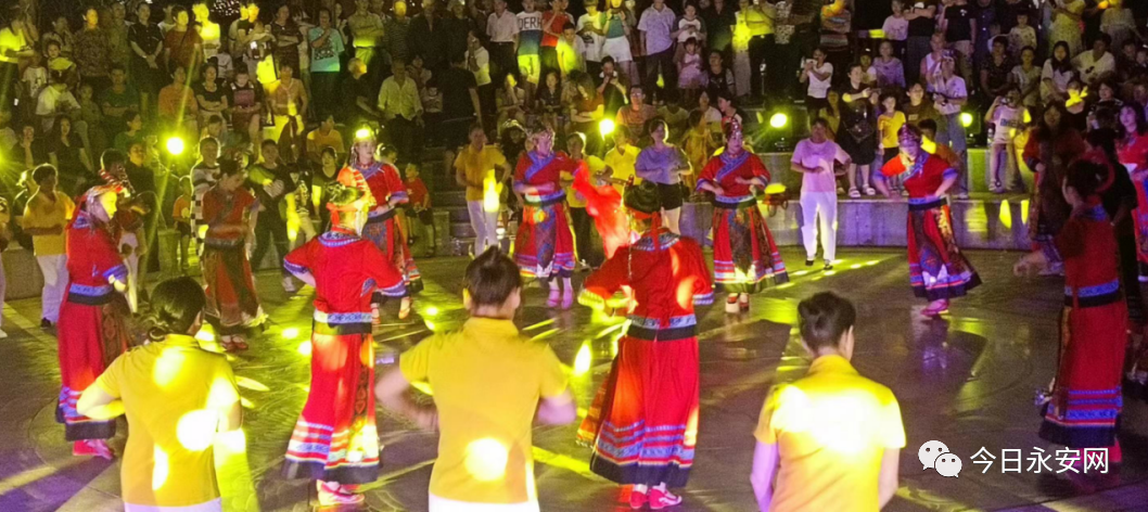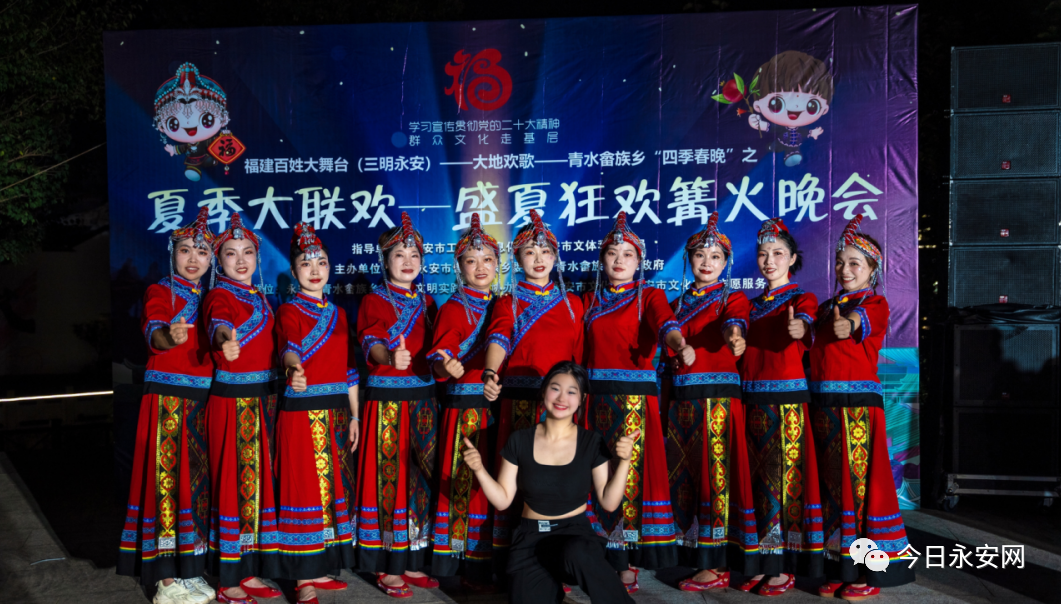 青水畲寨景区篝火盛会 活动现场,具有畲乡特色的《祈福灵刀》《小村来客》、《烟盒舞》《欢乐畲寨竹竿舞》等精彩节目轮番上演,异彩纷呈。在轻柔的夜色中,伴随着一曲曲嘹亮欢歌、一阵阵雷动掌声,各地游客和畲族人民“以舞会友”,手牵着手,肩靠着肩,围着熊熊篝火,激情互动,青春活力与畲乡风情有机融合,勾勒出了民族大团结最美的“同心圆”。